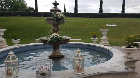 Fountain: Large and medium floral arrangements added to fountain with our lanterns. (Rental)