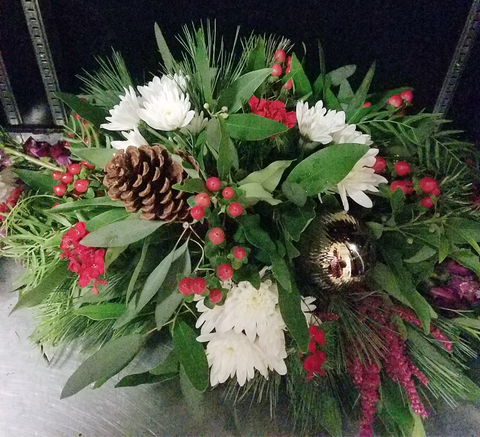 Jumbo arrangement of red roses and carnations with white roses and hydrangea and fresh greens.